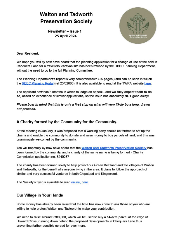 The Walton and Tadworth Preservation Society has been formed and is leading a community land purchase scheme in Walton on the Hill